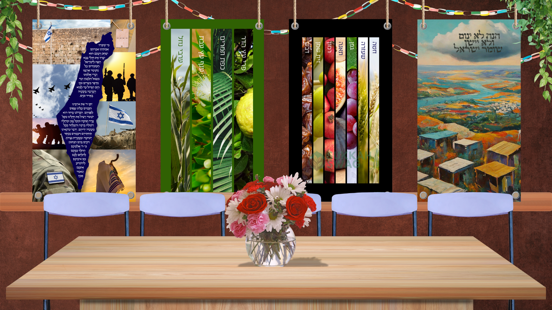 Each poster comes with sturdy grommets for simple, secure hanging and rolls up easily for storage, making it effortless to bring to your Sukkah year after year.